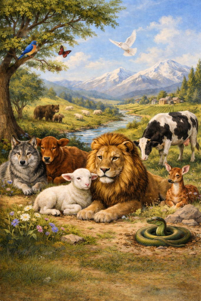 “For, behold, I create new heavens and a new earth: and the former shall not be remembered, nor come into mind… The wolf and the lamb shall feed together, and the lion shall eat straw like the bullock: and dust shall be the serpent’s meat. They shall not hurt nor destroy in all my holy mountain, saith the LORD.”